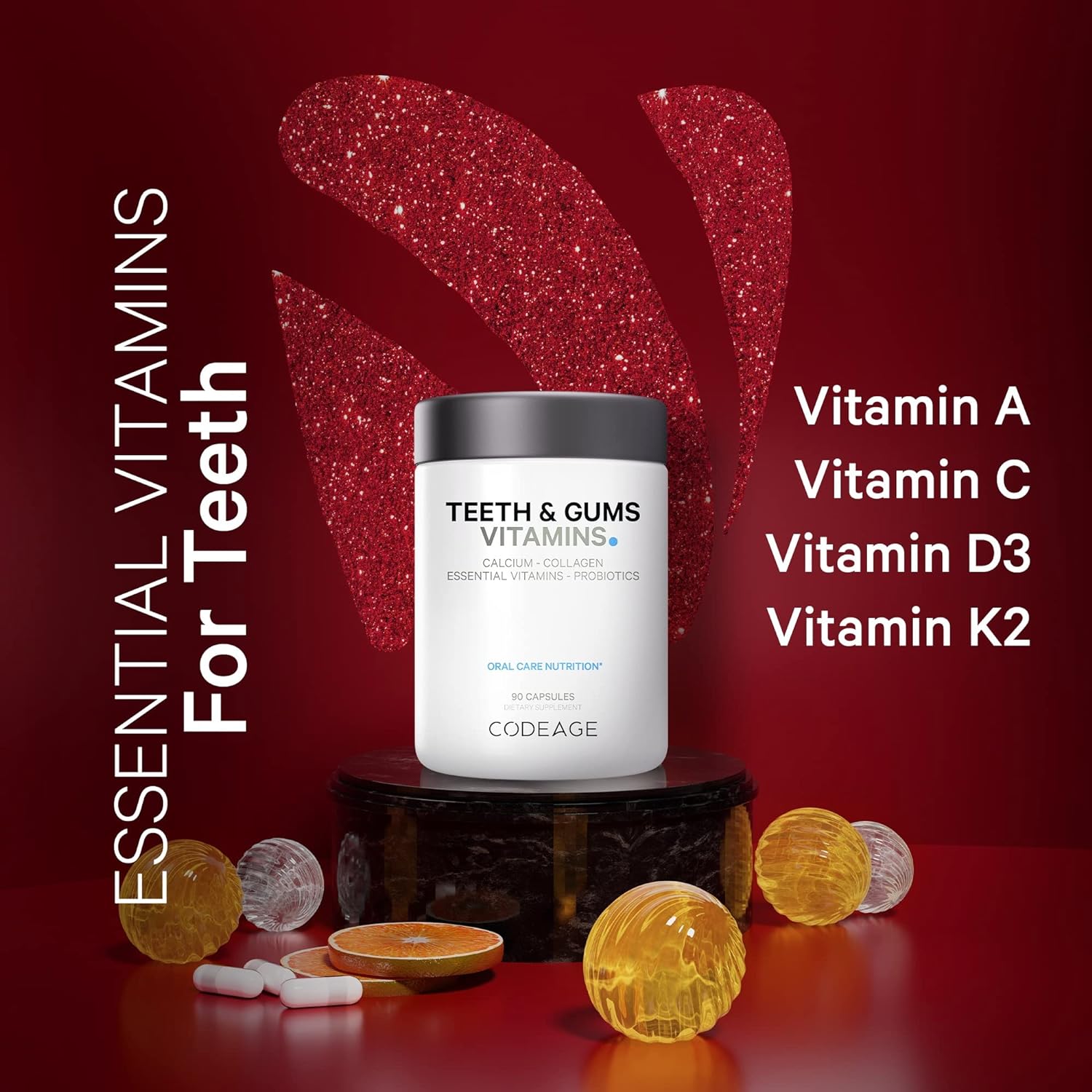 • Multivitamin for Teeth and Gums: Codeage Teeth & Gums vitamin offers essential vitamins A, C, D3 & K2 in an advanced oral care supplement. Vitamin A is important for forming the enamel, a layer that keeps teeth strong and resistant to substances that may cause cavities.* Vitamin C for teeth may help support gum health and prevent teeth decay by promoting saliva production and collagen synthesis.* Vitamin D may help with calcium absorption, while vitamin K2 may play a role in remineralization.*