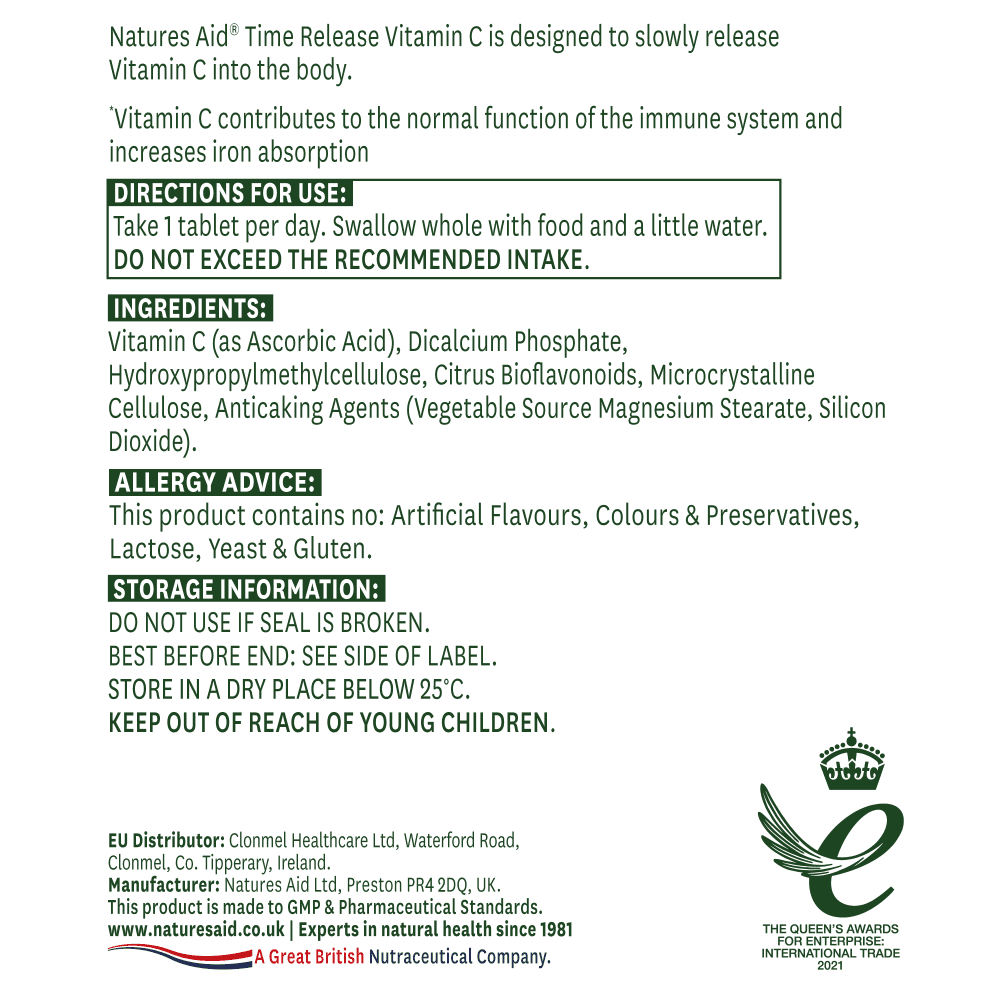 At Natures Aid, our Time Release Vitamin C has been carefully formulated by our in-house experts to provide you with 1000mg Vitamin C in every tablet. Our tablet is designed to slowly release Vitamin C into your body throughout the day. One vegan friendly tablet should be swallowed whole, with a cold drink each day. You can rest assured our Time Release Vitamin C is free from any colours or flavours and does not contain any GMO, gluten, yeast, dairy, nuts, soya, sugar or sweeteners.