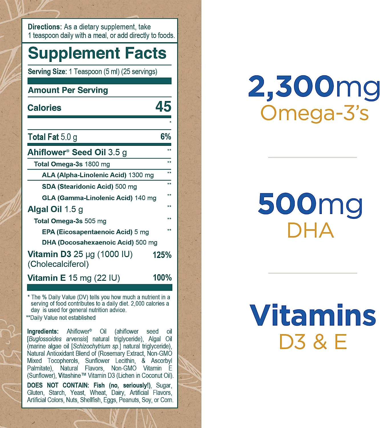 • Vegan Omega-3: This liquid supplement has over 2300mg of omega-3 fatty acids in each teaspoon, including 500mg of DHA omega-3s